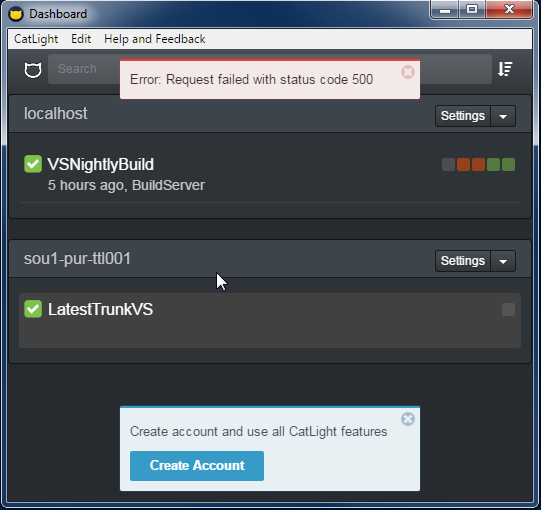 Currently have CatLight connected to Jenkins version 2.46.2. CatLight will give notification when builds start/finish but will give the above error when I try to start a build through CatLight. Proper credentials are provided for Jenkins login.