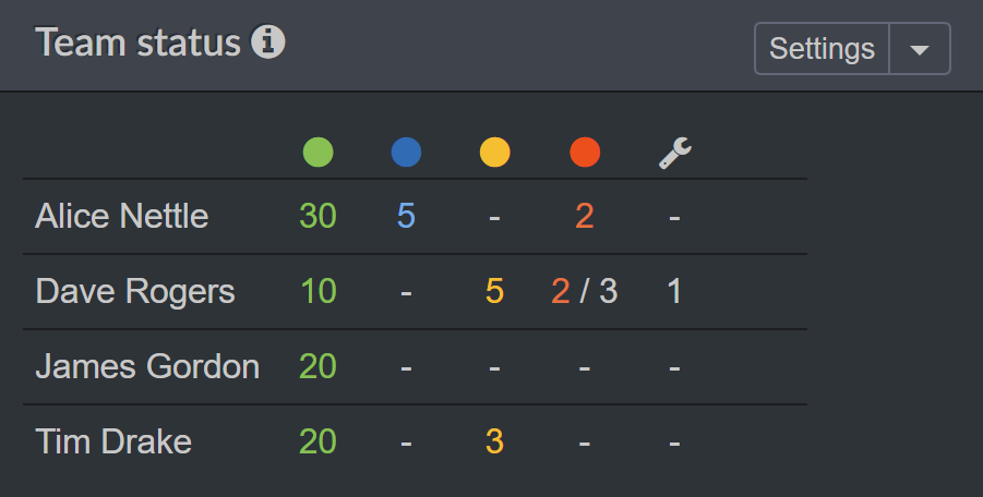 Team status CatLight can show the status of your team members For every user, this report will show the number of items in different states on their dashboards. To add this report, go to teams menu > show team status. catlight Posted · Updated Follow Was this article helpful? Yes No 0 out of 0 found this helpful
